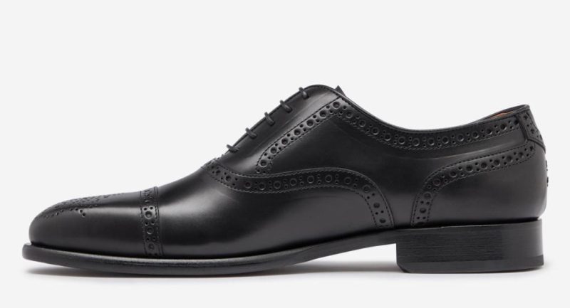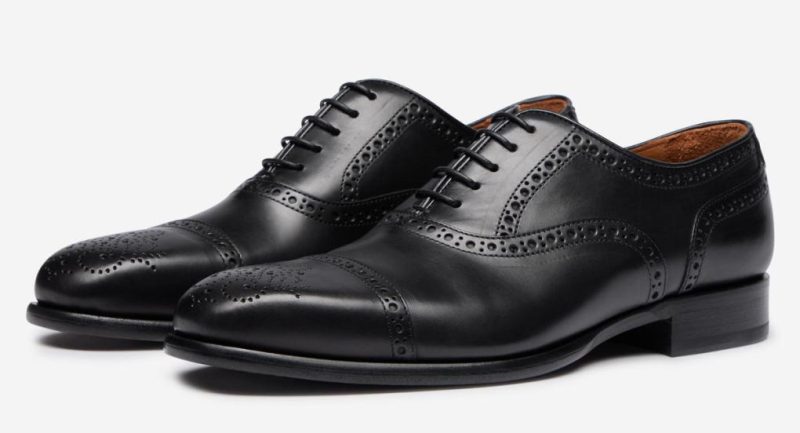 Our premium Oxford toe cap brogue is made in our artisan factory in Le March Italy and now available in classic black pristine meticulously polished calf leather. The upper has a neatly piped topline and is set on an elegant, slightly square toed last, Blake stitched to a leather sole with a concealed channel. As you’d expect we’ve included a full leather lining and insock, with an additional cushioned leather heel pad.